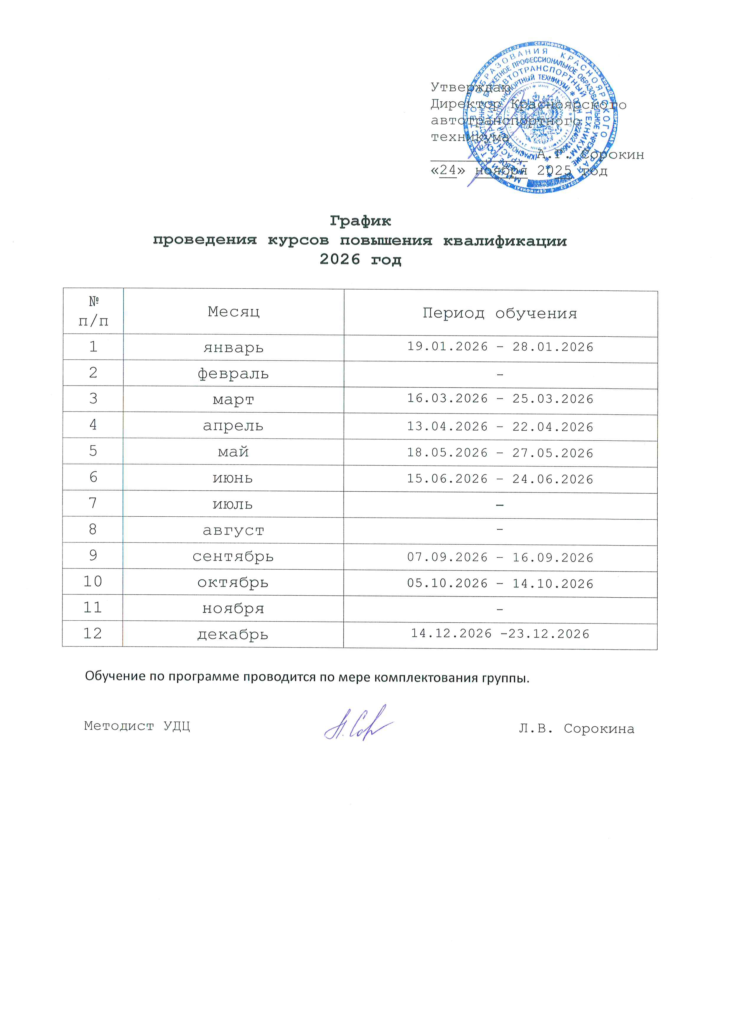 проведения курсов повышения квалификации
