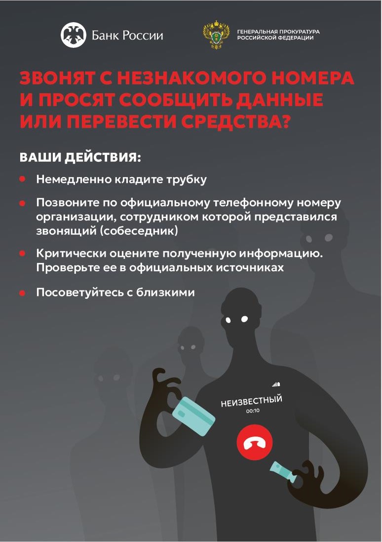 Ввиду возрастания угроз преступных посягательств в обозначенной сфере Генеральной прокуратурой Российской Федерации совместно с Банком России разработаны цифровые плакаты в целях повышения уровня информированности населения о действиях лиц, вводящих в заблуждение в целях хищения денежных средств.