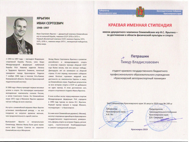 Петрашин Тимур Владиславович награжден Краевой именной стипендией имени двукратного чемпиона Олимпийских игр И.С. Ярыгина - за достижения в области физической культуры и спорта